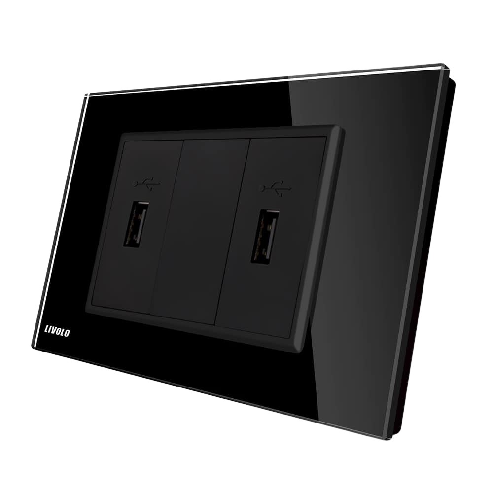 Priza dubla USB Livolo cu rama din sticla – standard italian, negru, VL-C392U-82
