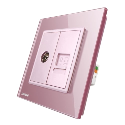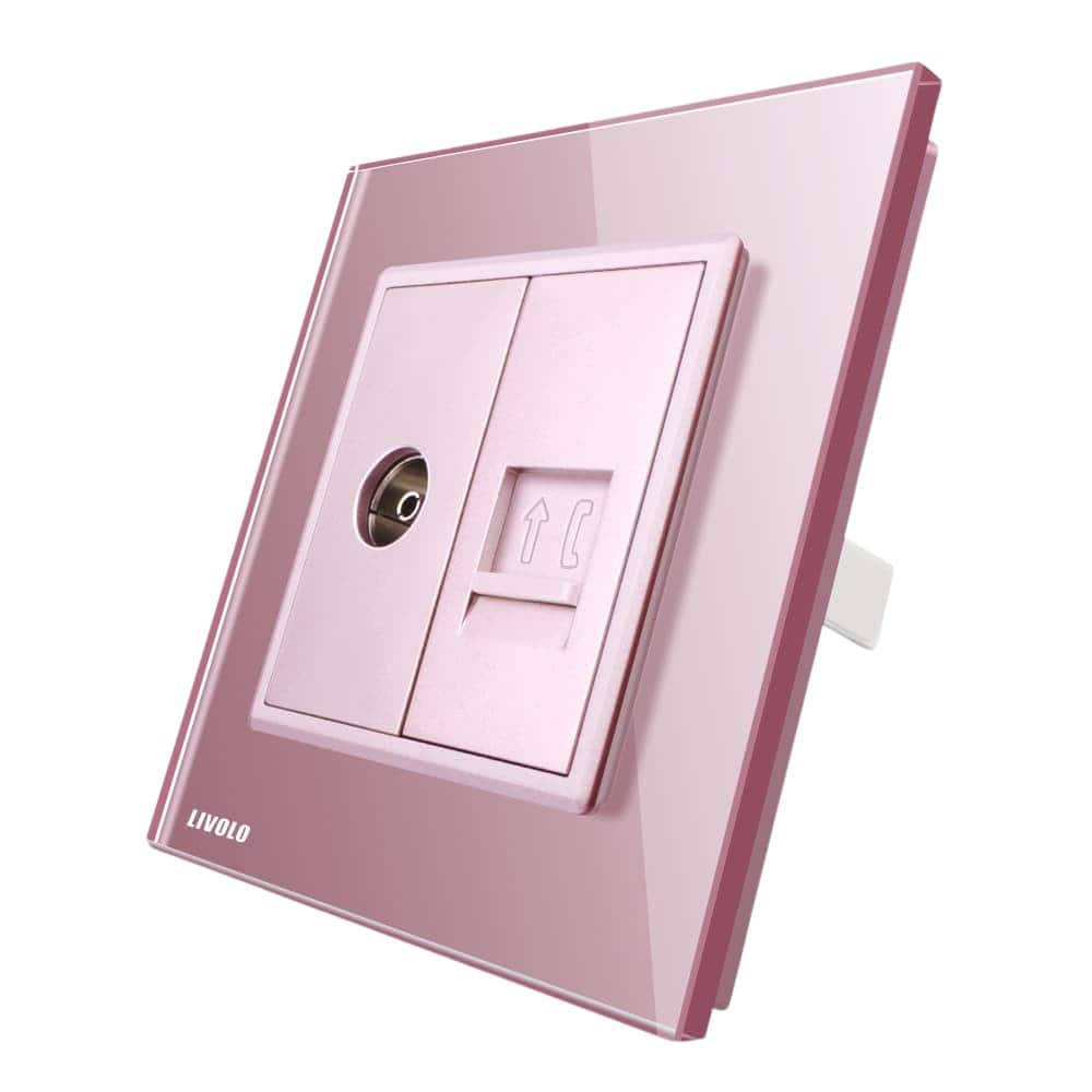 Priza dubla TV + priza internet Livolo cu rama din sticla, roz, VL-C791VC-17