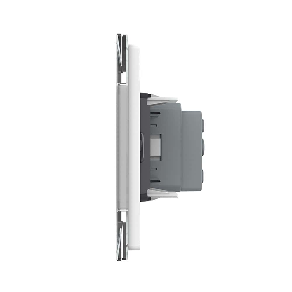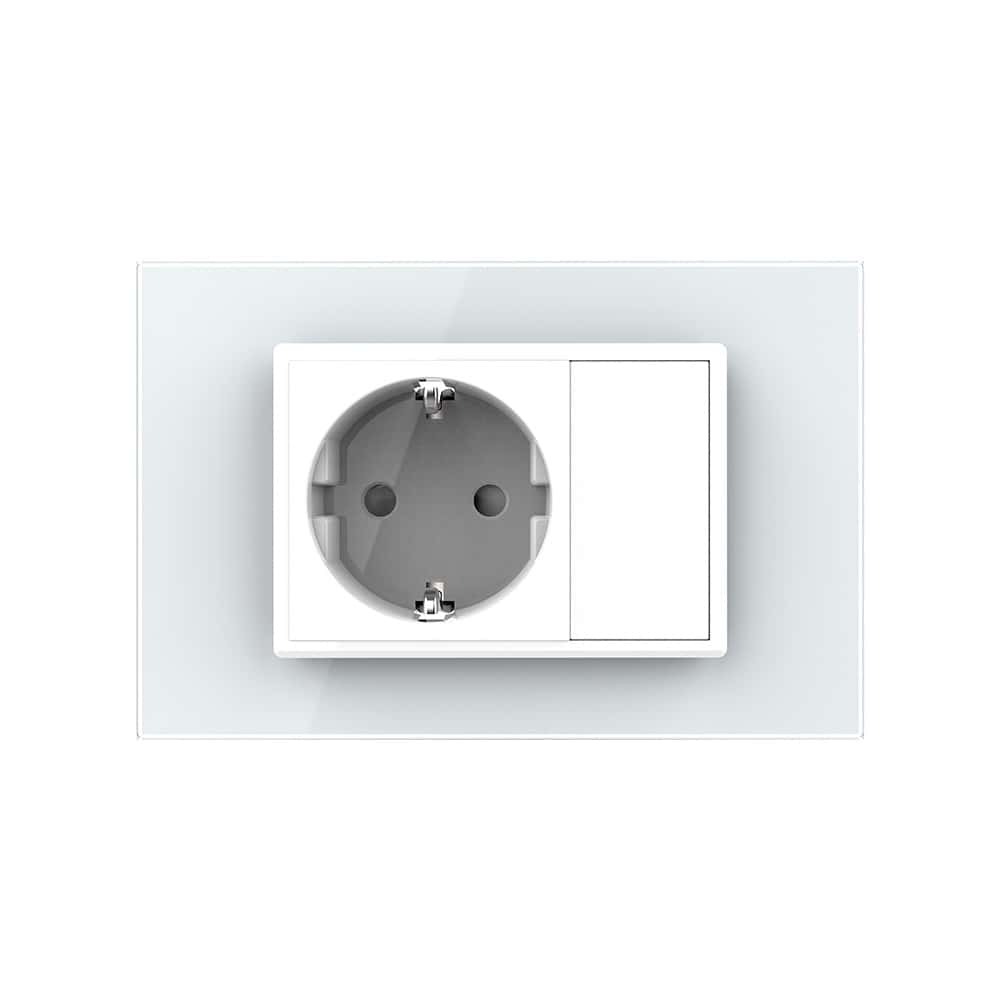 Priza simpla Livolo cu rama din sticla, model italian pentru case, birouri, spatii comerciale, hoteluri. Produse moderne de inalta calitate. Produsul este compatibil cu doze modulare in 3 module cu distanta dintre suruburi de 85 mm.