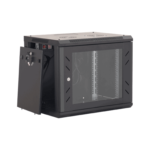 Cabinet metalic neasamblat cu montare pe perete ce permite instalarea echipamentelor standard 19′ dar si a celor pentru CCTV, CATV prin utilizarea de rafturi aditionale.
