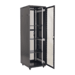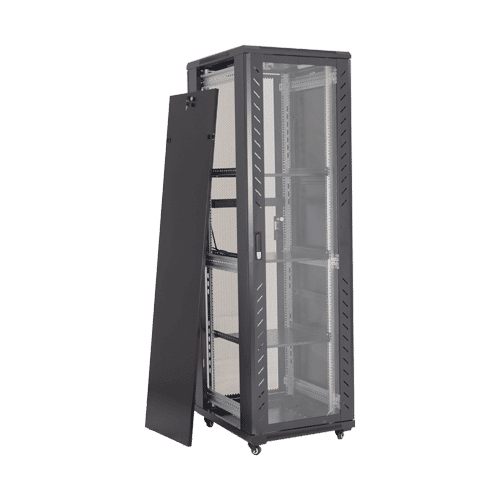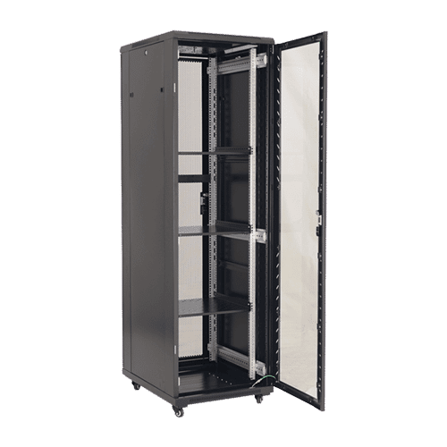 Cabinet metalic neasamblat de podea ce permite instalarea echipamentelor standard 19′ dar si a celor pentru CCTV, CATV prin utilizarea de rafturi aditionale.