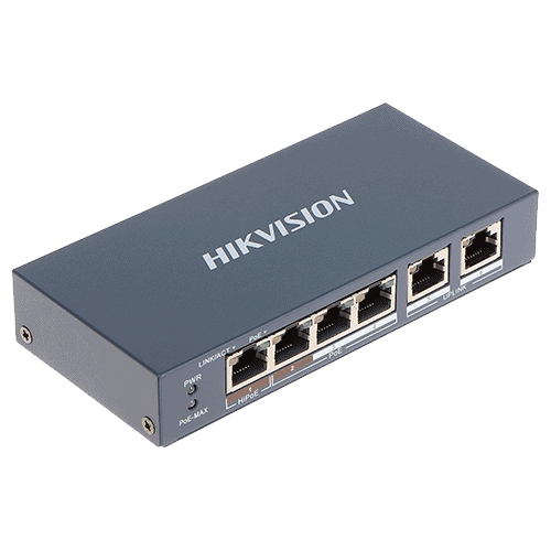 DS-3E0310HP-E este echipat cu 2 porturi de uplink 10/100/1000 Mbs – 1 port pentru NVR si un port pentru conectare la router iar porturile PoE comunica doar cu porturile de uplink.